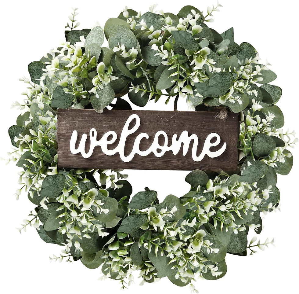 Sggvecsy 16in Artificial Eucalyptus Wreath with Welcome Sign Green